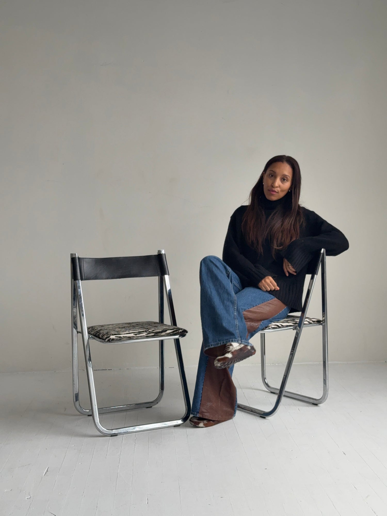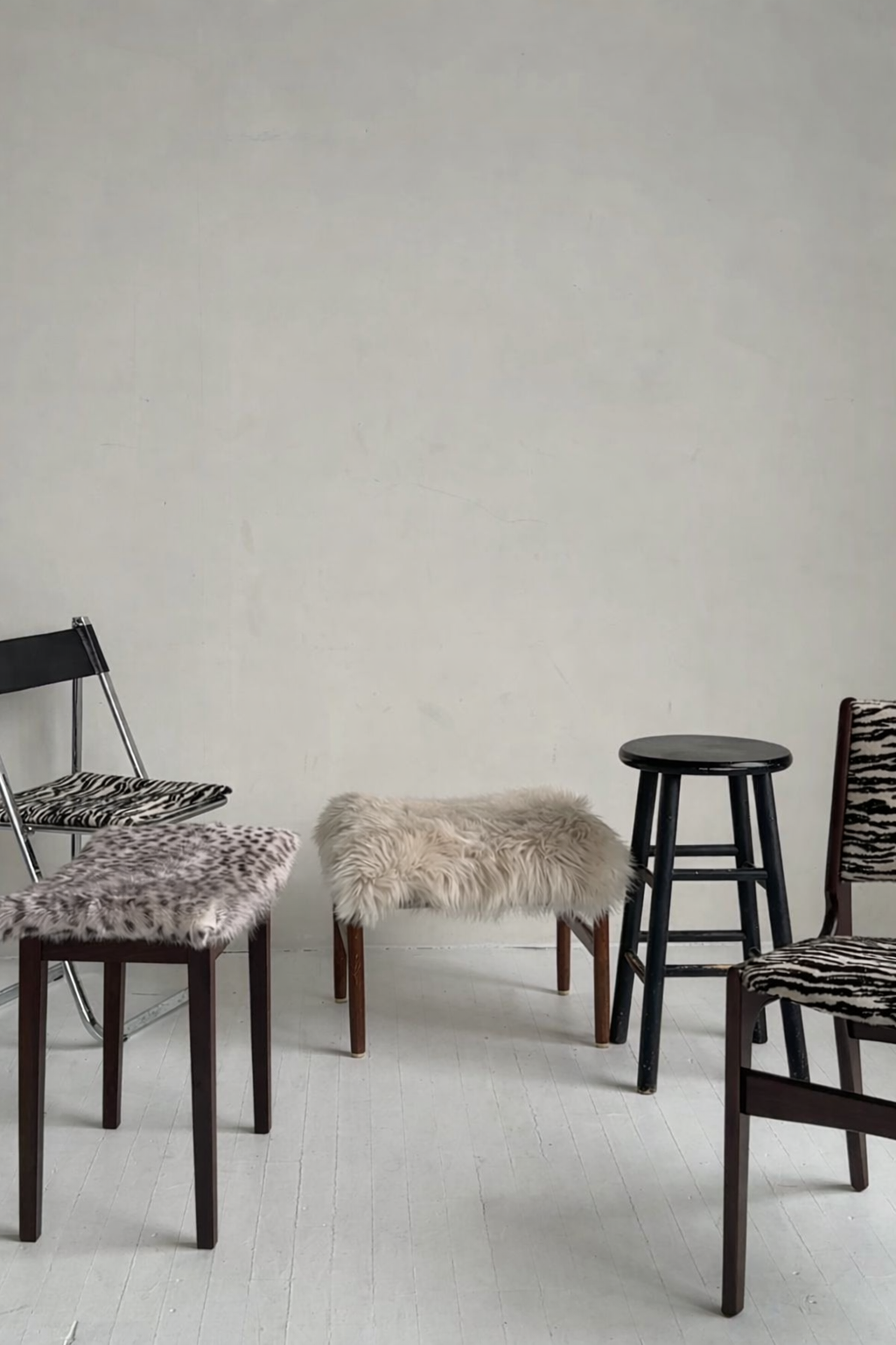 vintage chrome and wood frames reworked in calf hair and shearling.