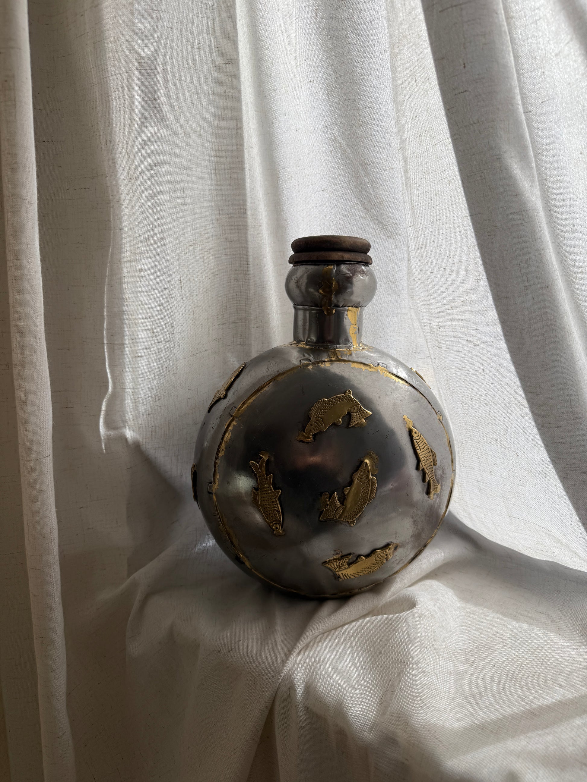 a sculptural round-bodied flask from india, crafted in pewter with applied brass fish motifs. tactile and weighty, this piece strikes a balance between folk craftsmanship and decorative object. stopper intact. works beautifully as a shelf accent or bar cart statement.