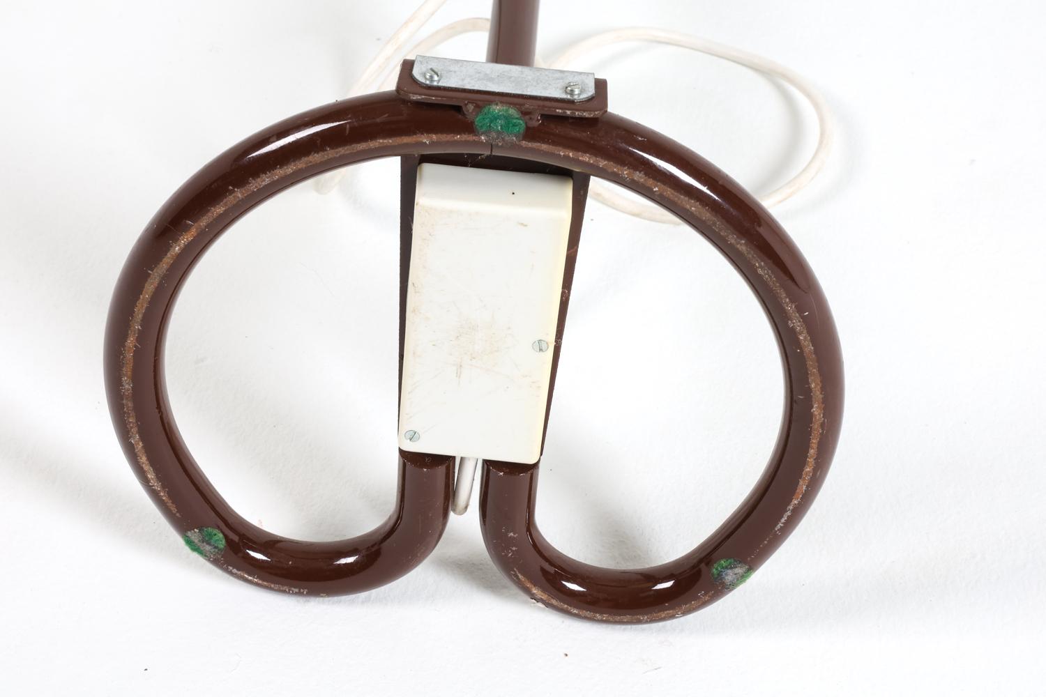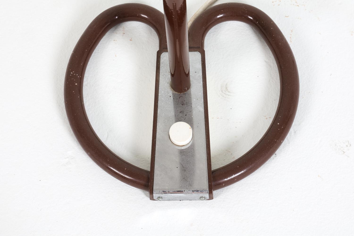 swedish floor lamp by anders pehrson for atelje lyktan, from the bumling series, circa 1970s. deep brown enamel finish with circular base and pivoting shade. rewired for u.s. use. minor scuffs and scratches. wear consistent with age and use.