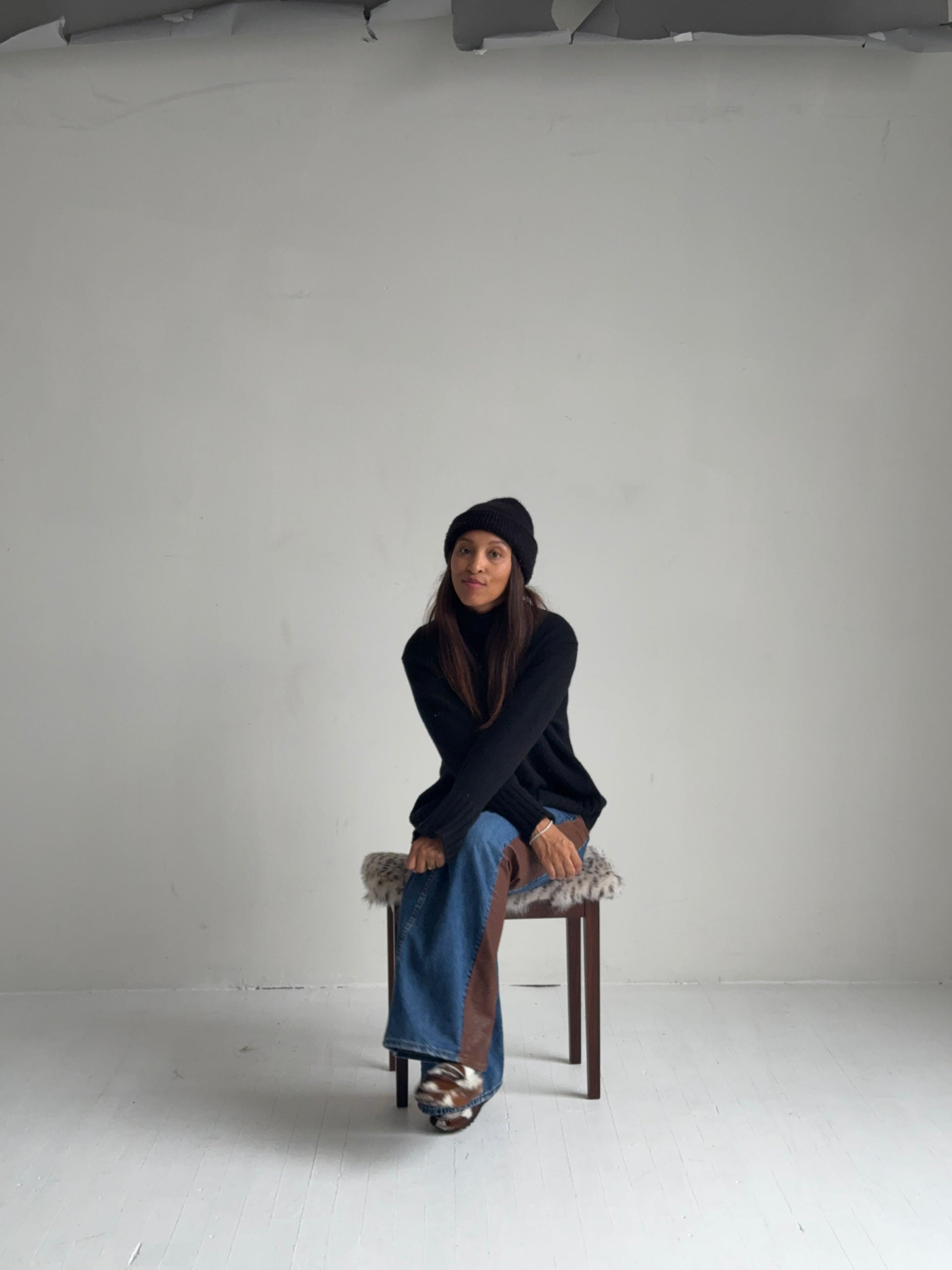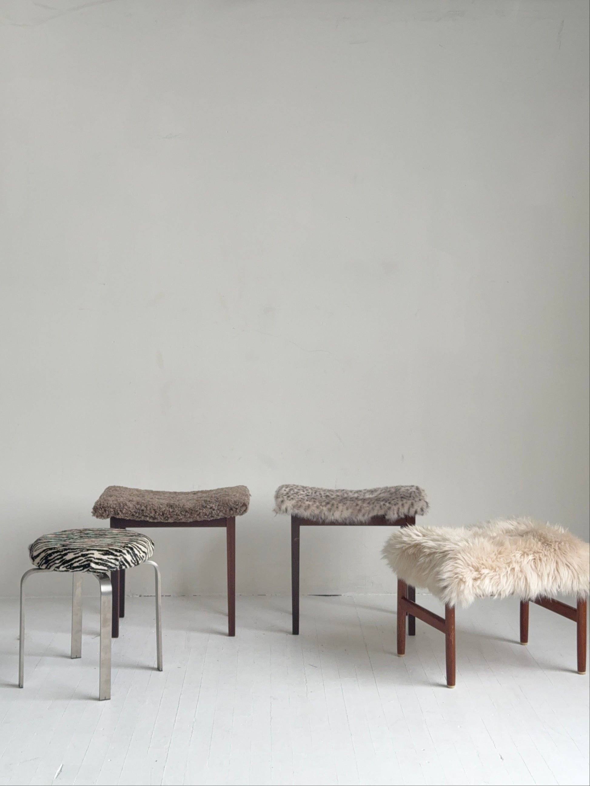 danish footstool with rosewood veneers and a gently curved seat. reupholstered in a spotted toscana shearling through lolo marais’ chrome atelier, adding texture and pattern to the slim mid-century frame. a sculptural accent for a vanity, bedside, entry, or layered seating moment.