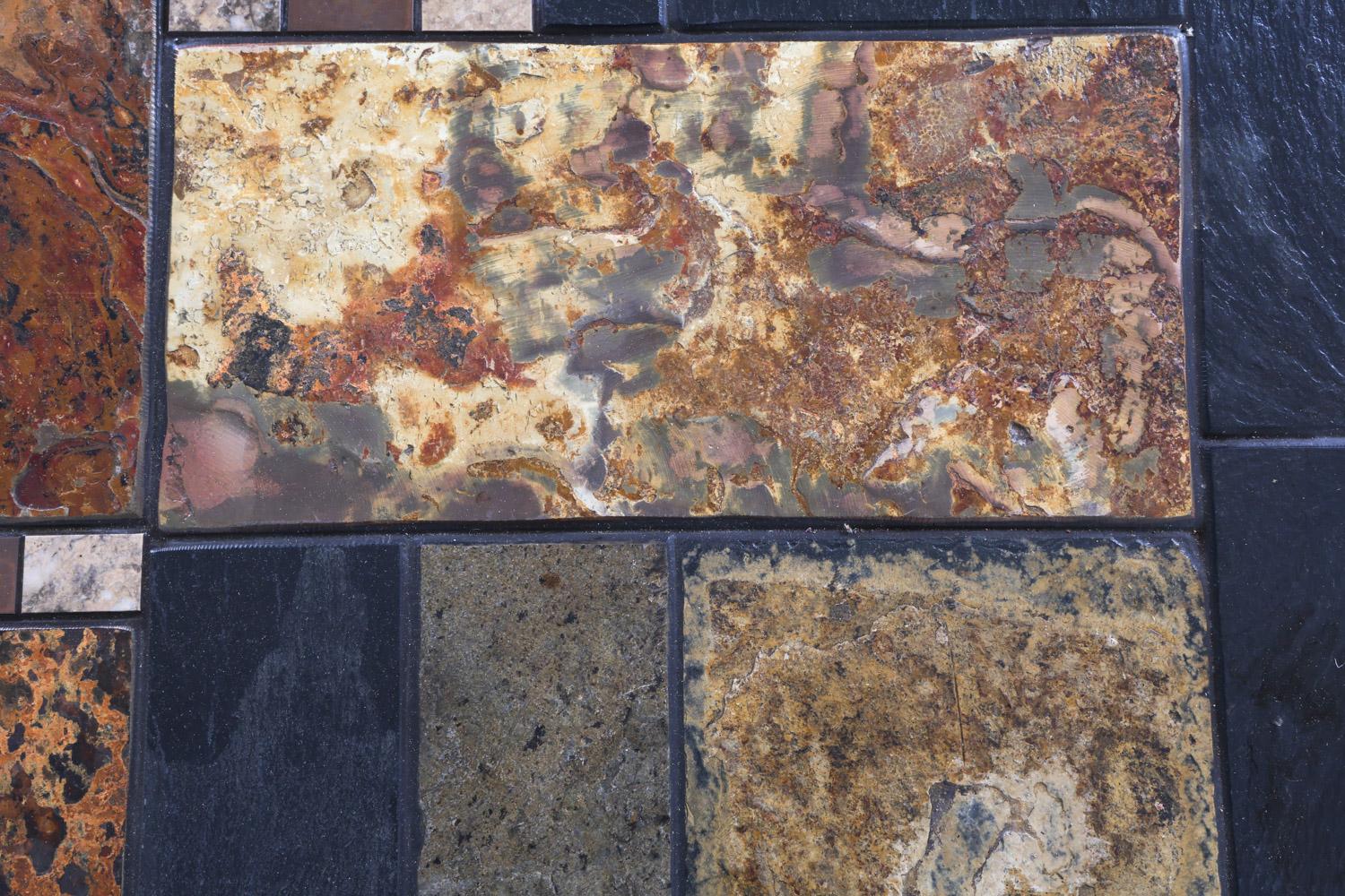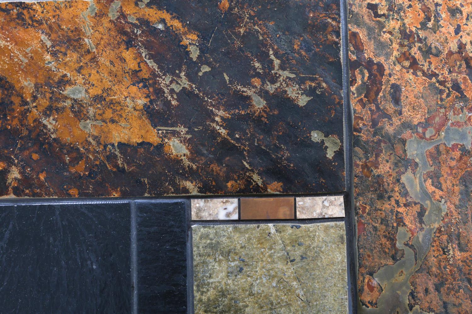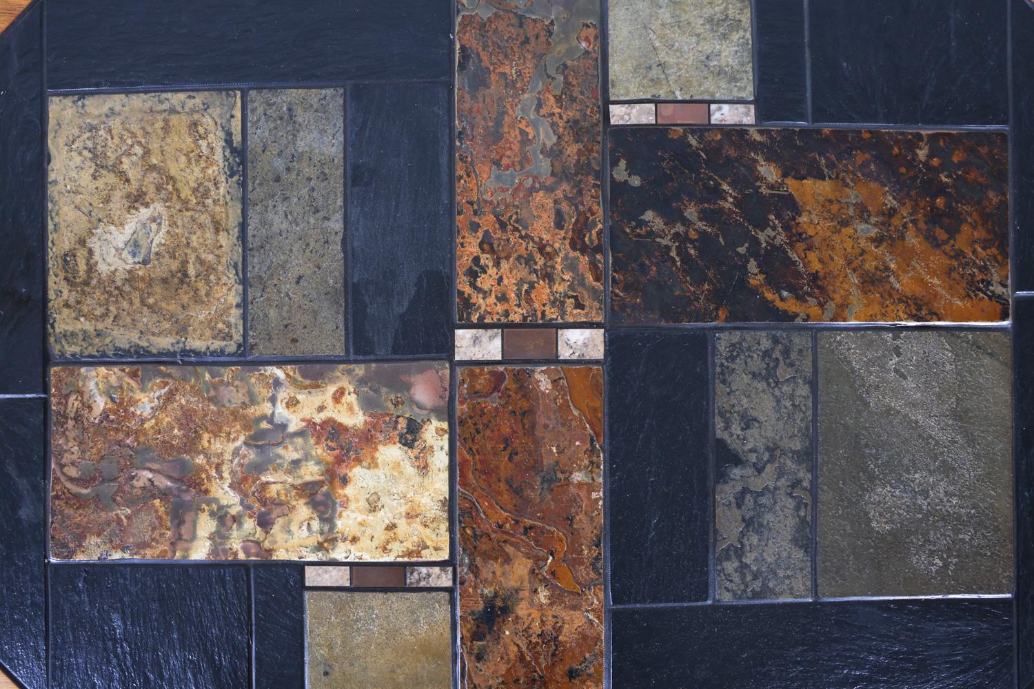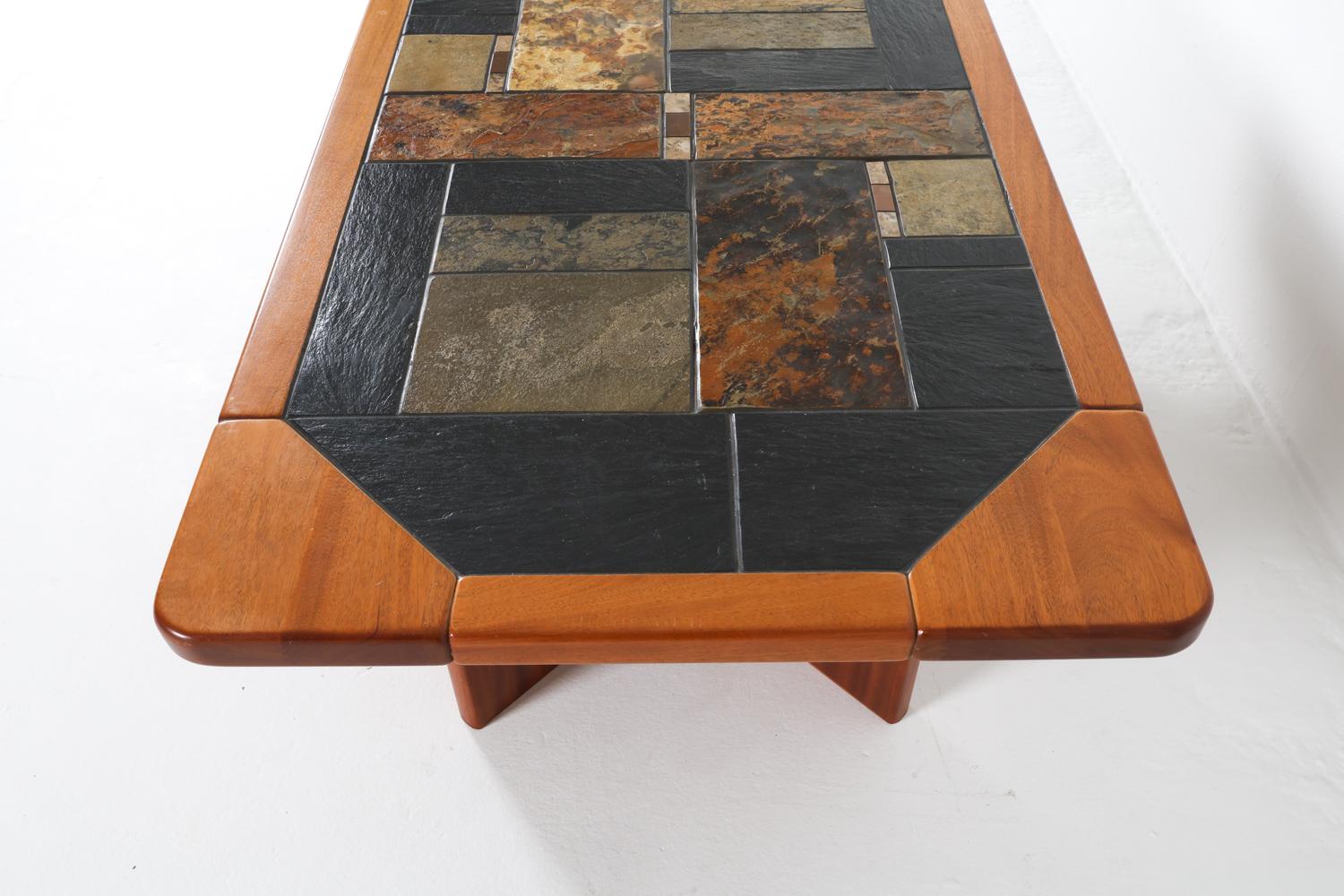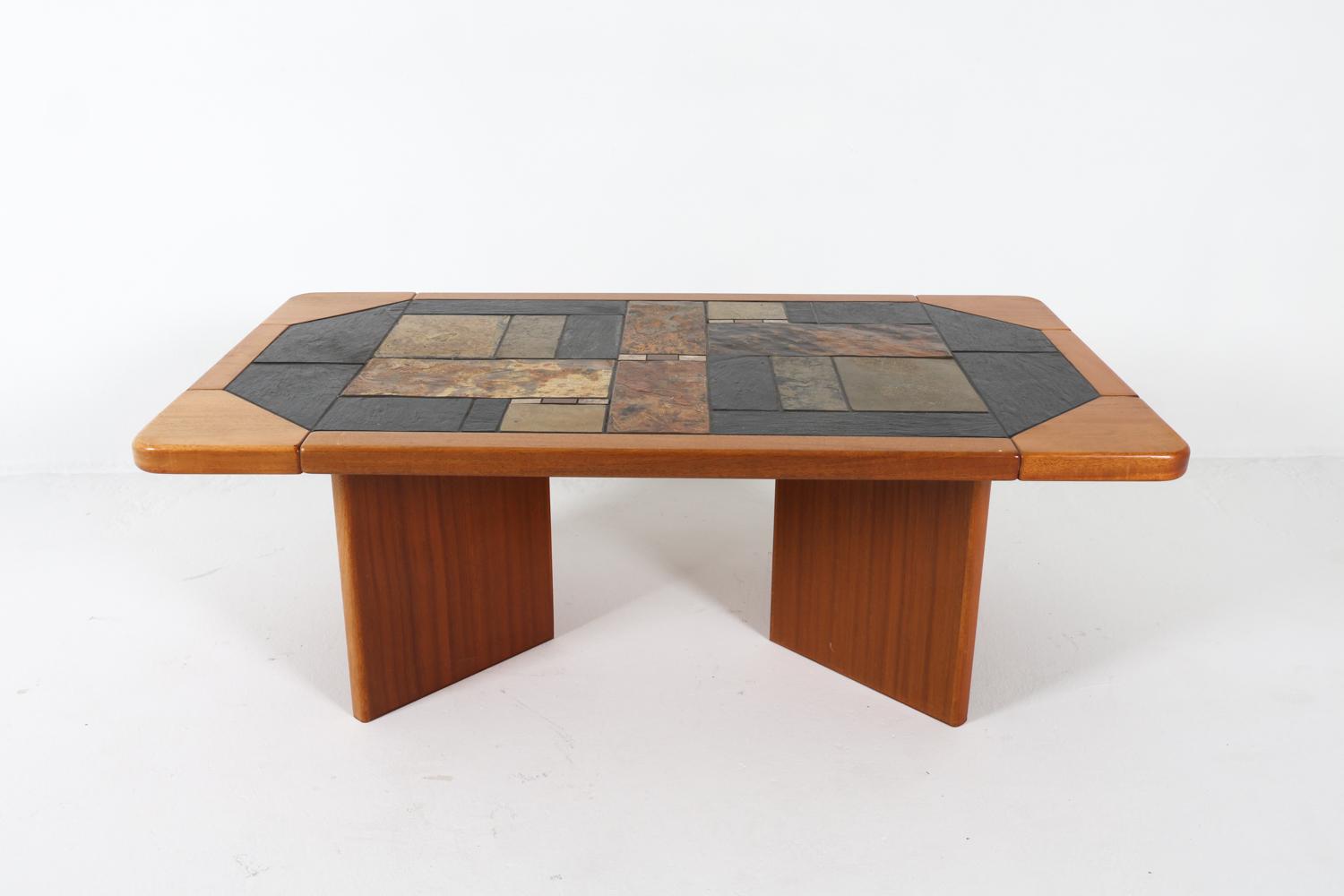 rectangular coffee table with teak frame and inlaid stone tile top. denmark, circa 1970s. geometric mosaic of natural stone in earthy tones, set within a solid teak surround. minor scuffs, scratches, and dings to wood. wear consistent with age and use.