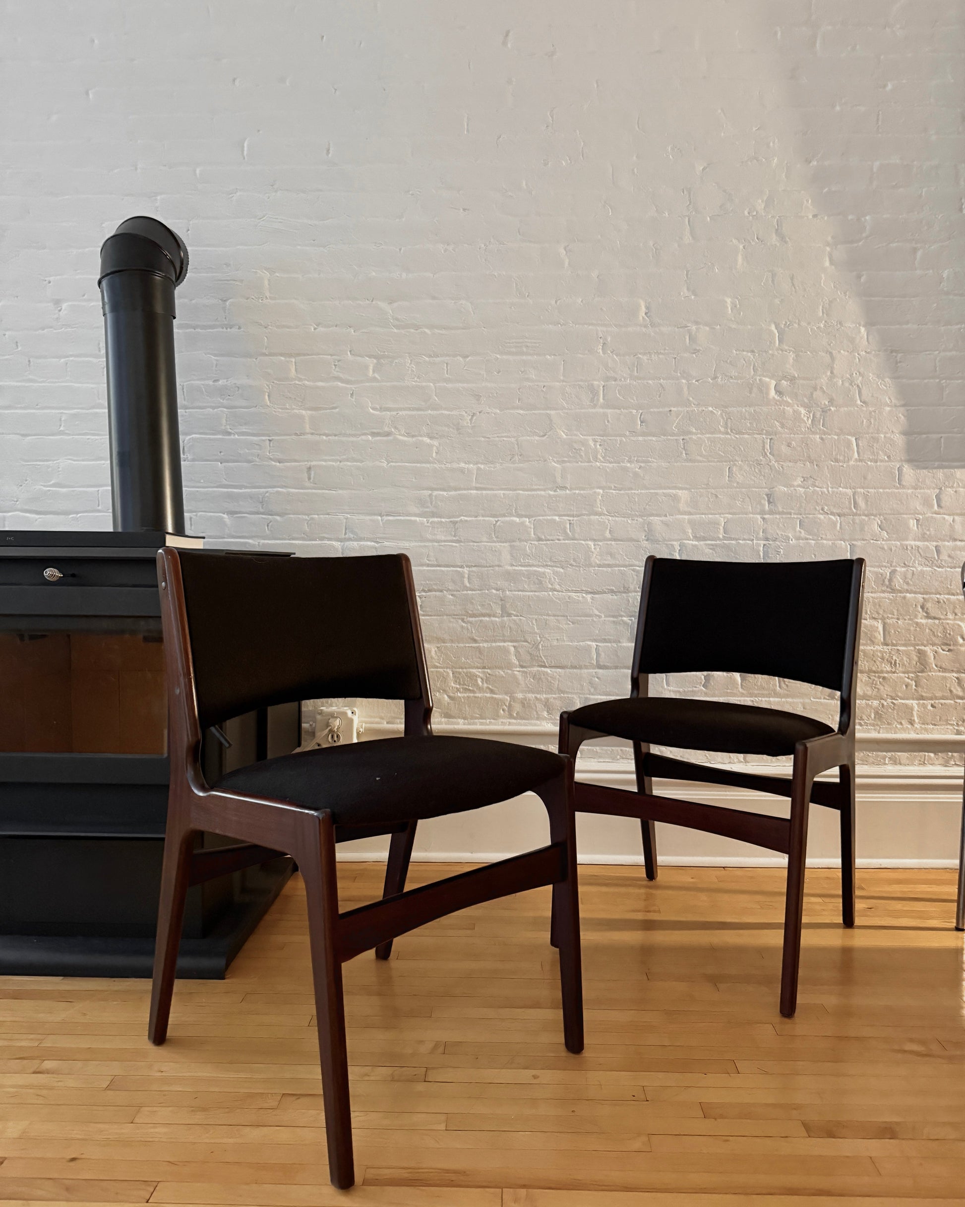 a pair of vintage erik buch dining chairs crafted in richly toned rosewood. sculptural frames with elegant proportions, newly reupholstered in a high-quality chocolate wool that adds warmth and contrast while keeping the silhouette clean and modern. a timeless mid-century design that works beautifully around a dining table, at a desk, or as accent seating.