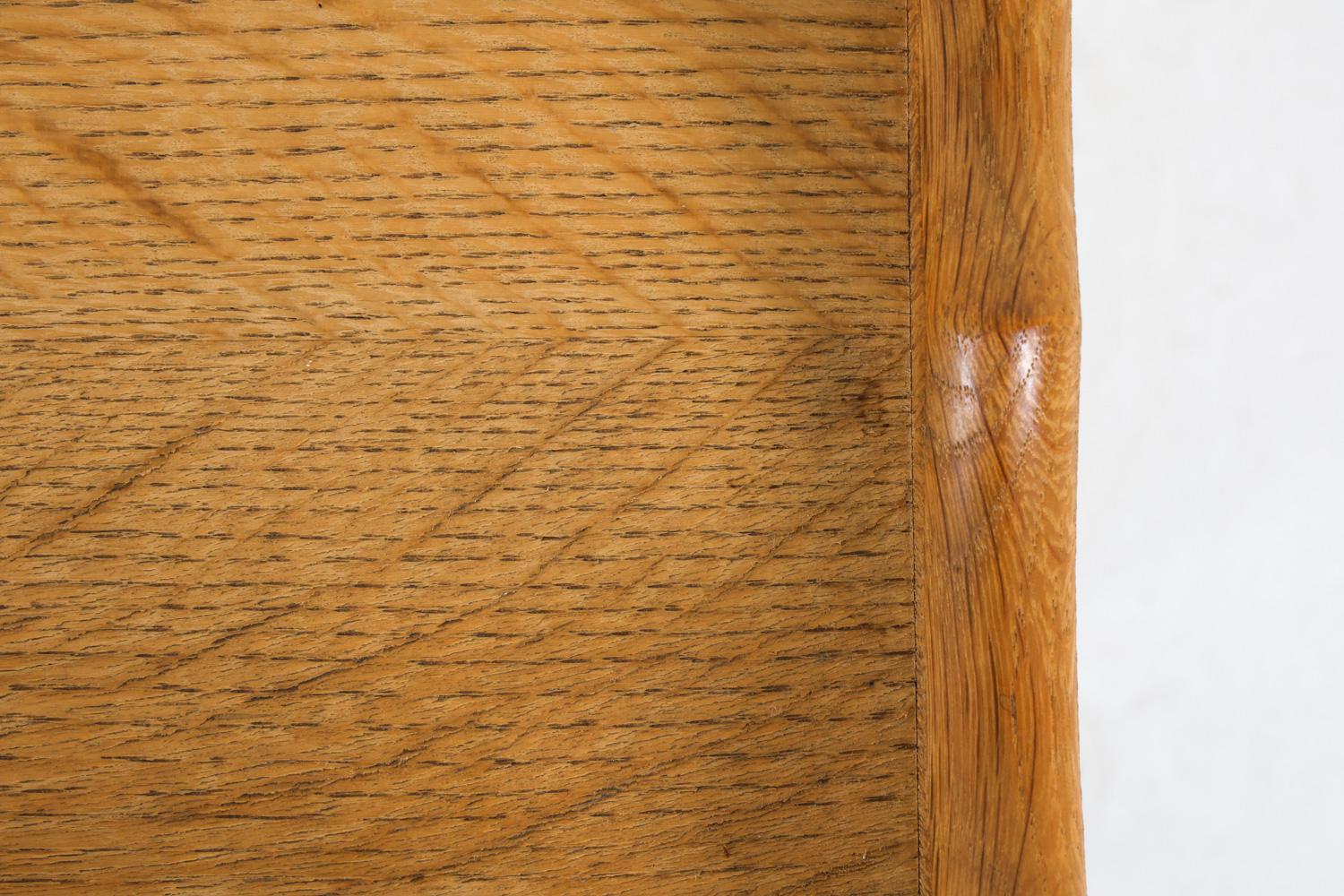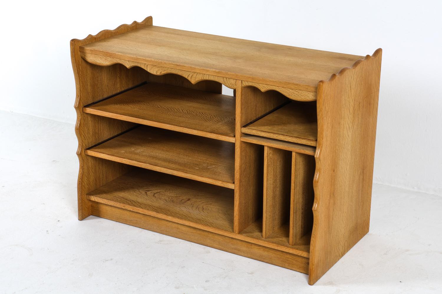 oak bookcase with sliding shelves in the style of henning kjaernulf. denmark, circa 1970s. sculpted edges with versatile open compartments and dividers. minor scuffs and scratches. wear consistent with age and use.