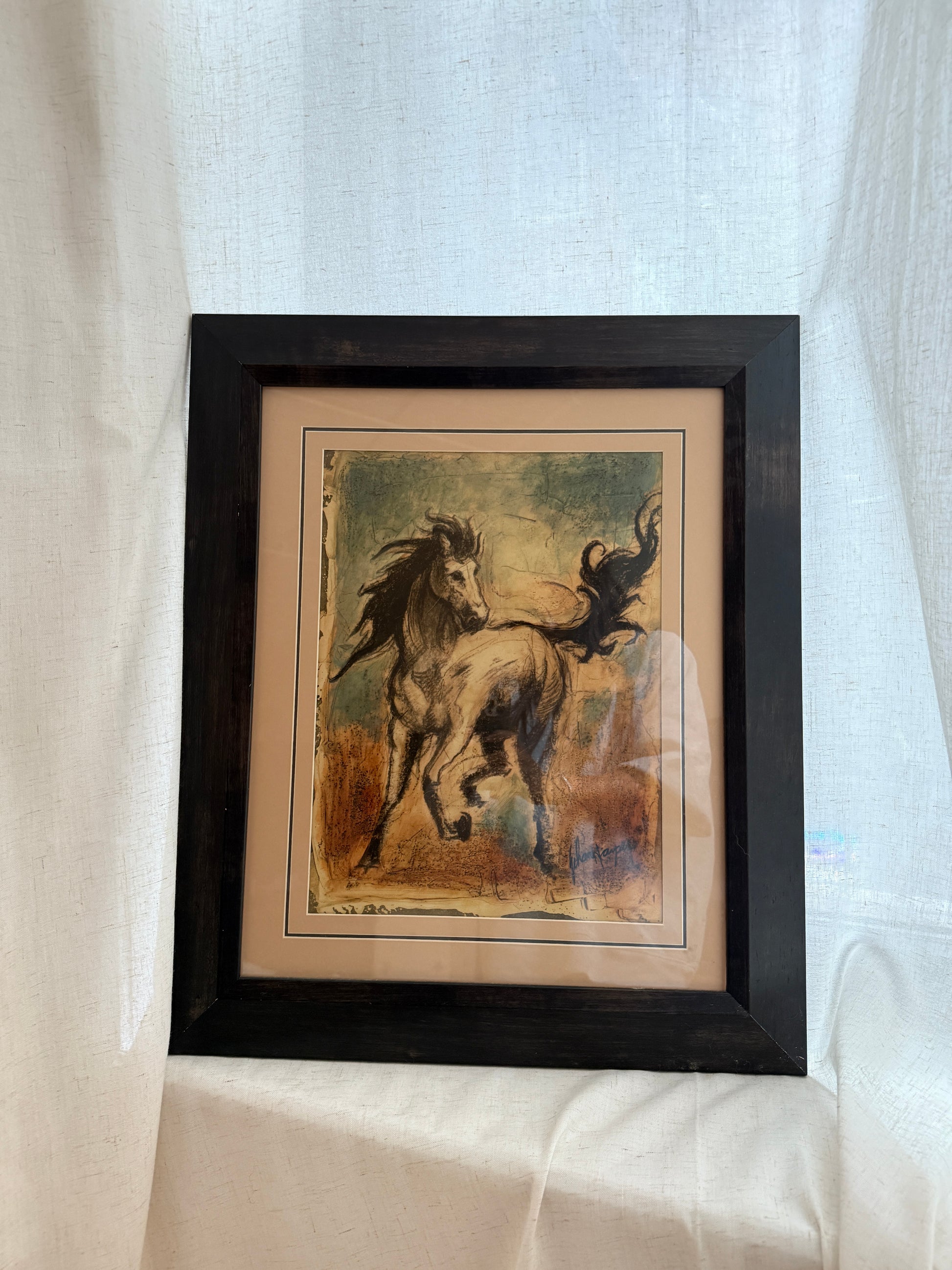 a dynamic equine study by johann kappel, rendered in charcoal and wash on paper. known for his expressive line and instinctive sense of movement, kappel captures the strength and grace of the horse with striking immediacy. mounted under double matting and framed in dark-stained wood.