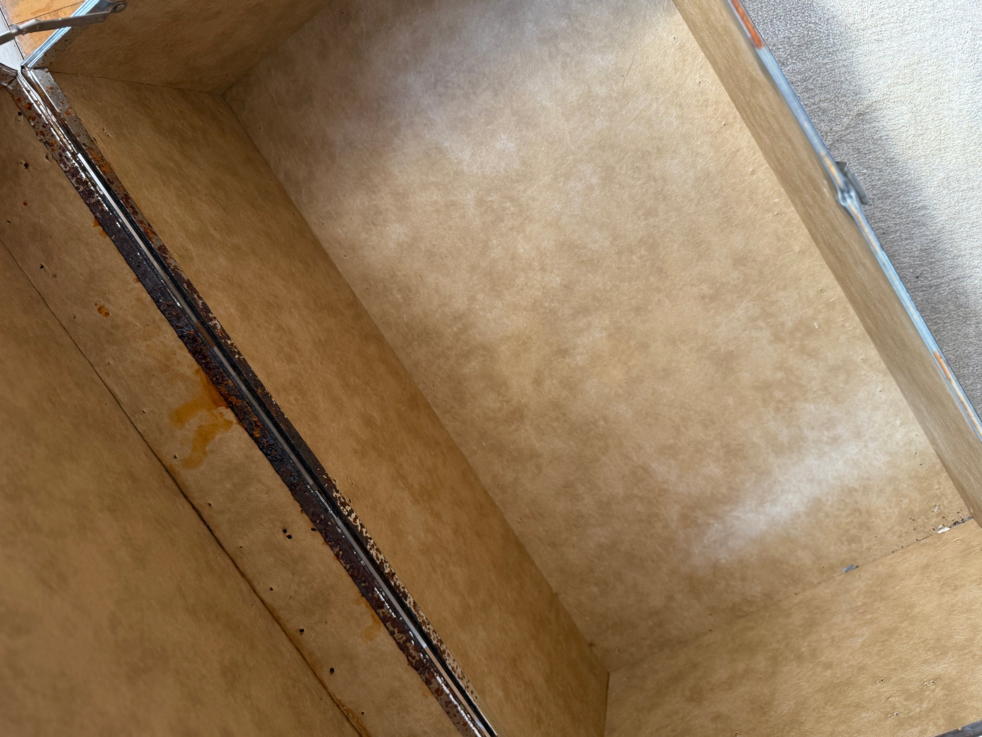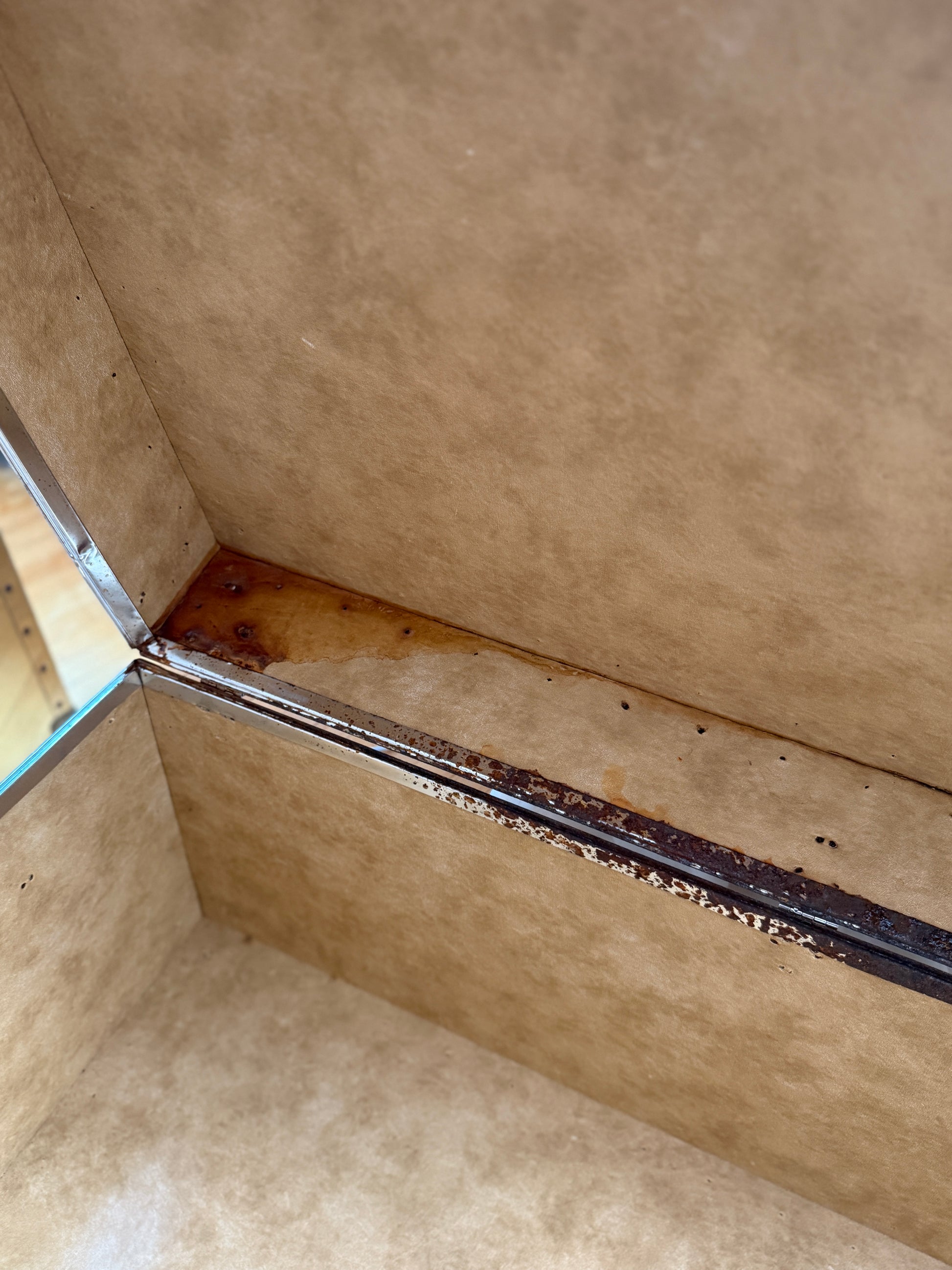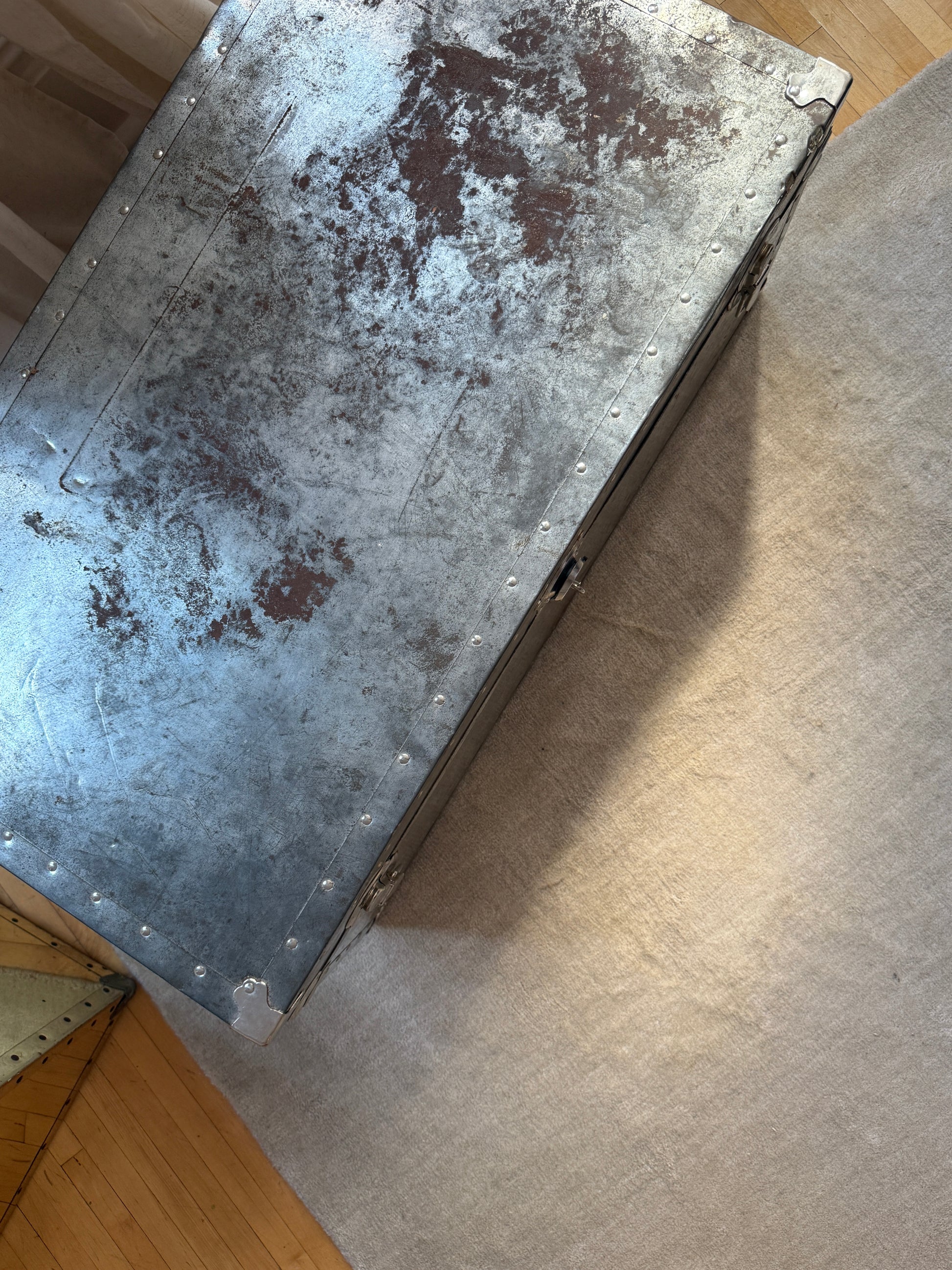a rare large chrome steamer trunk with riveted edges and original hardware. bold, sculptural, and industrial - this piece doubles as storage, coffee table, or statement accent. the trunk carries the marks of time in its hardware, adding to its lived-in allure while remaining fully functional.