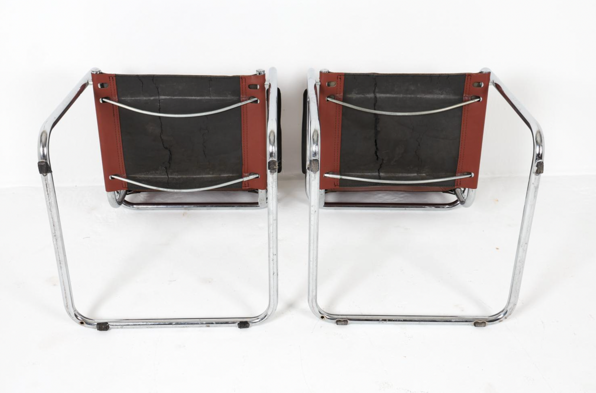 a set of four vintage italian cantilever dining chairs attributed to mart stam for breuer. tubular chrome steel frames with brown leather sling seats and backs. designed circa 1970s, these chairs embody the balance of modernist structure and lived-in patina. timeless, sculptural, and comfortable.