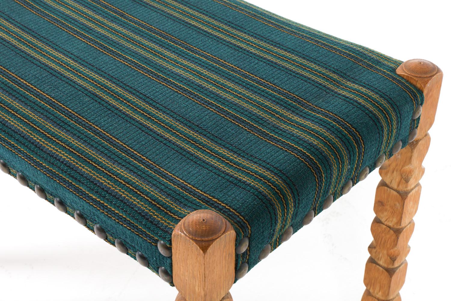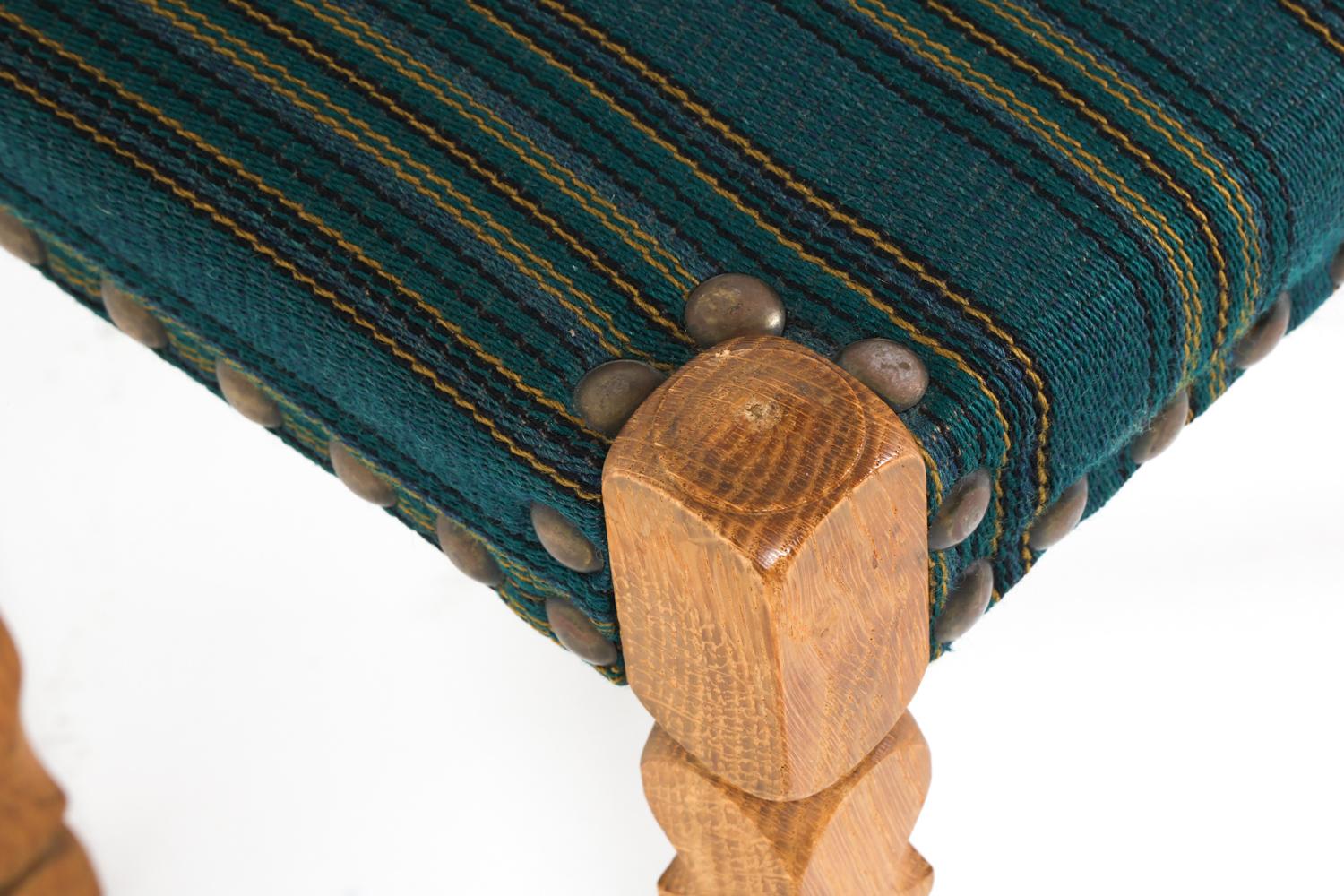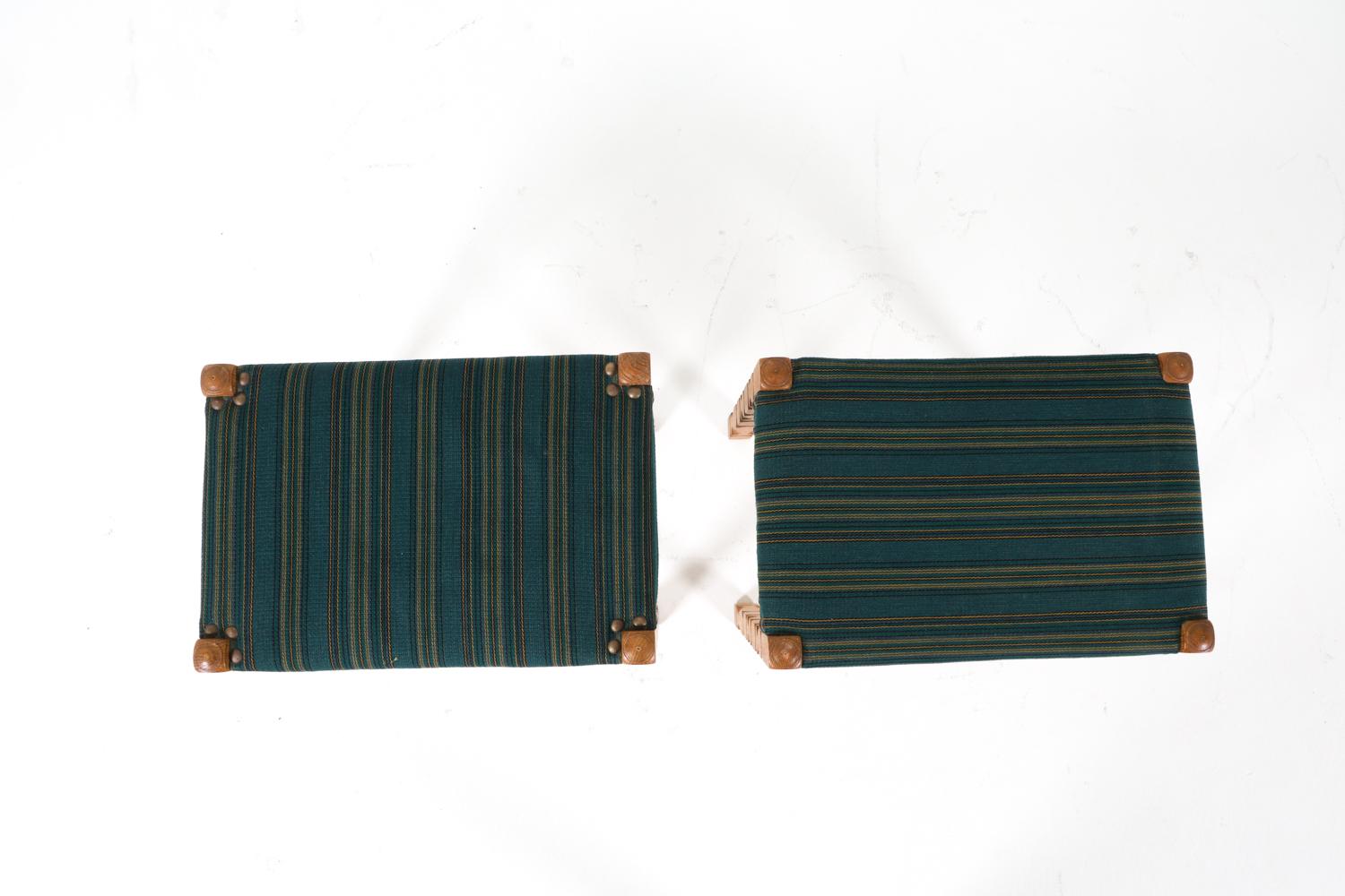 pair of oak stools with wool upholstery, in the style of henning kjaernulf. denmark, circa 1960s. turned oak legs with striped wool seats. one stool missing a few brass tacks to top, with minor dings and rubs to legs. wear consistent with age and use.