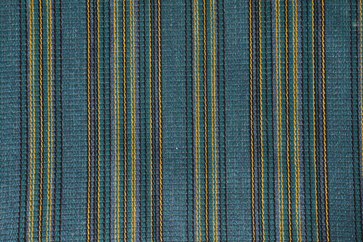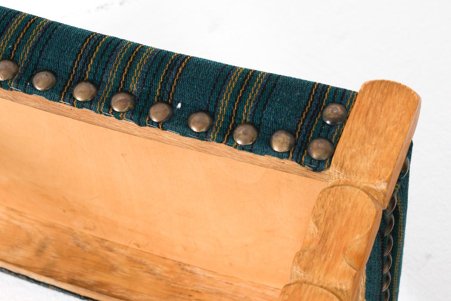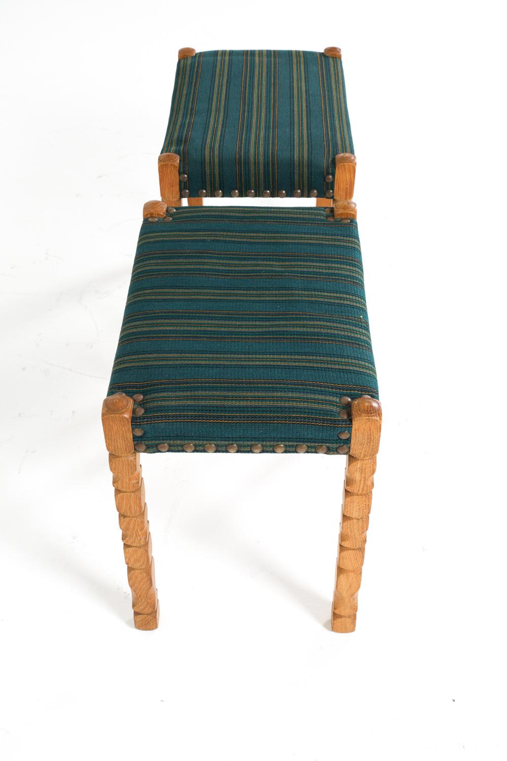 pair of oak stools with wool upholstery, in the style of henning kjaernulf. denmark, circa 1960s. turned oak legs with striped wool seats. one stool missing a few brass tacks to top, with minor dings and rubs to legs. wear consistent with age and use.