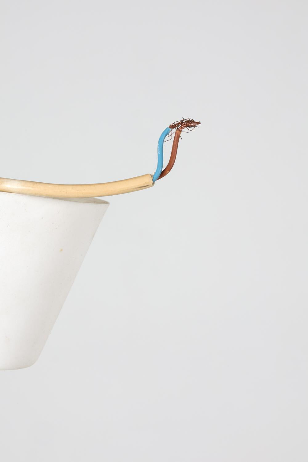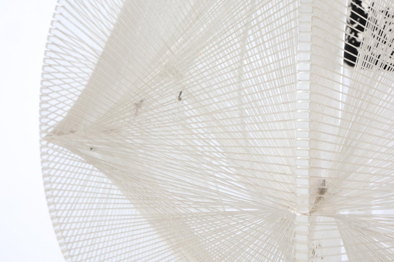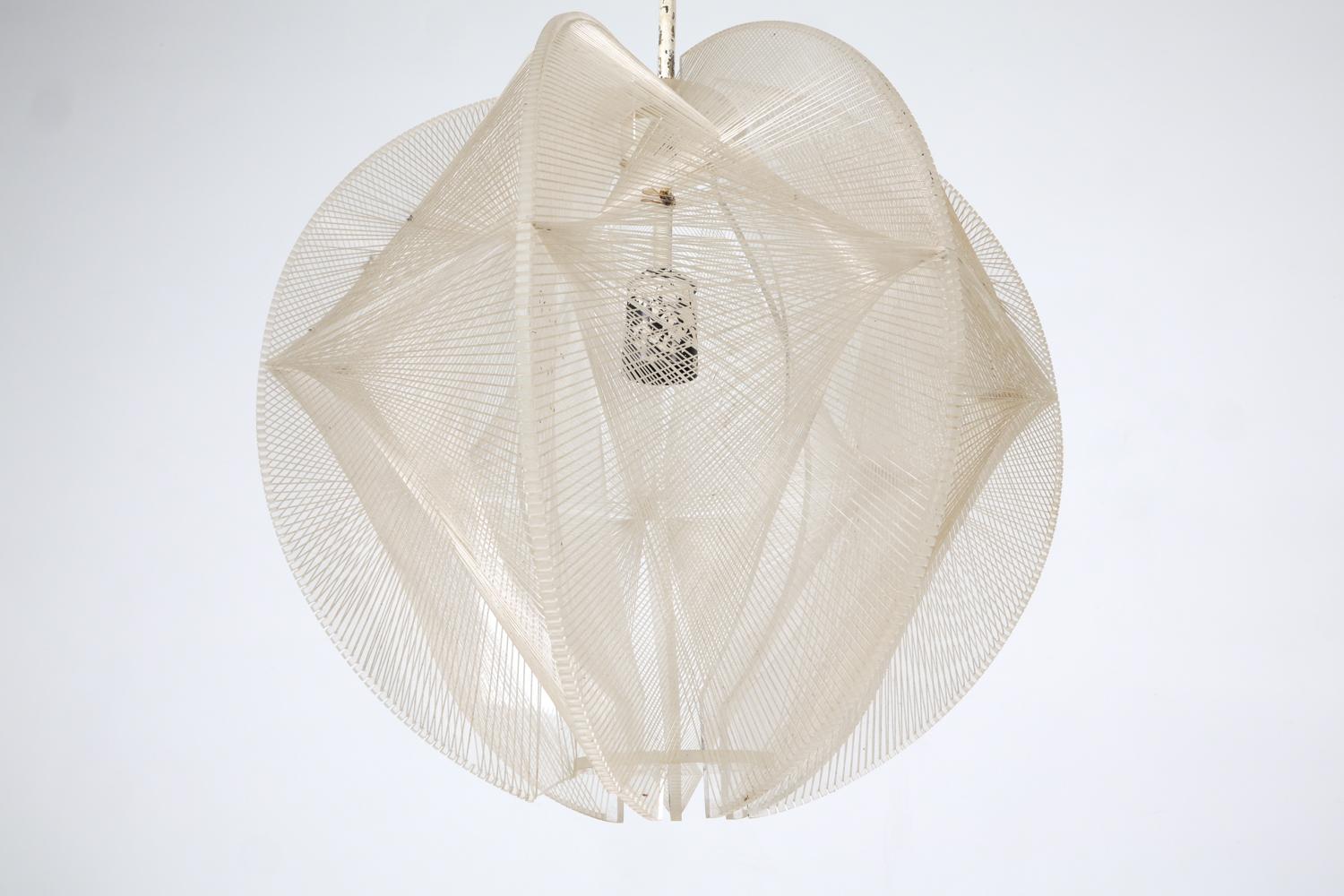 pendant light designed by poul secon for sompex. germany, circa 1970s. nylon thread stretched over a geometric frame, creating a sculptural translucent form. wiring untested. minor sun fading. wear consistent with age and use.