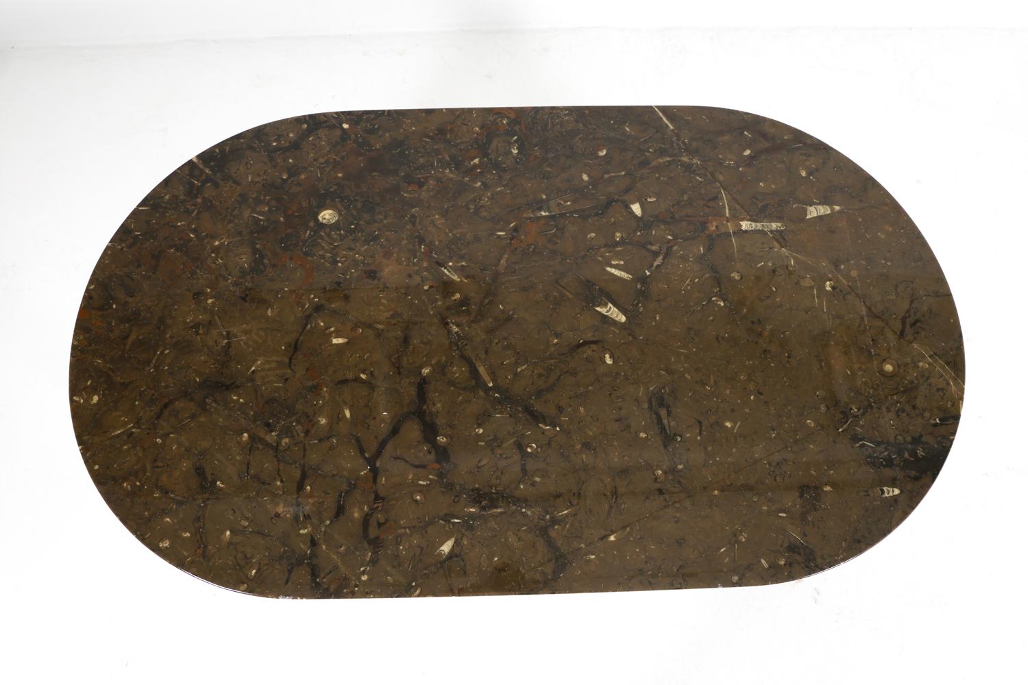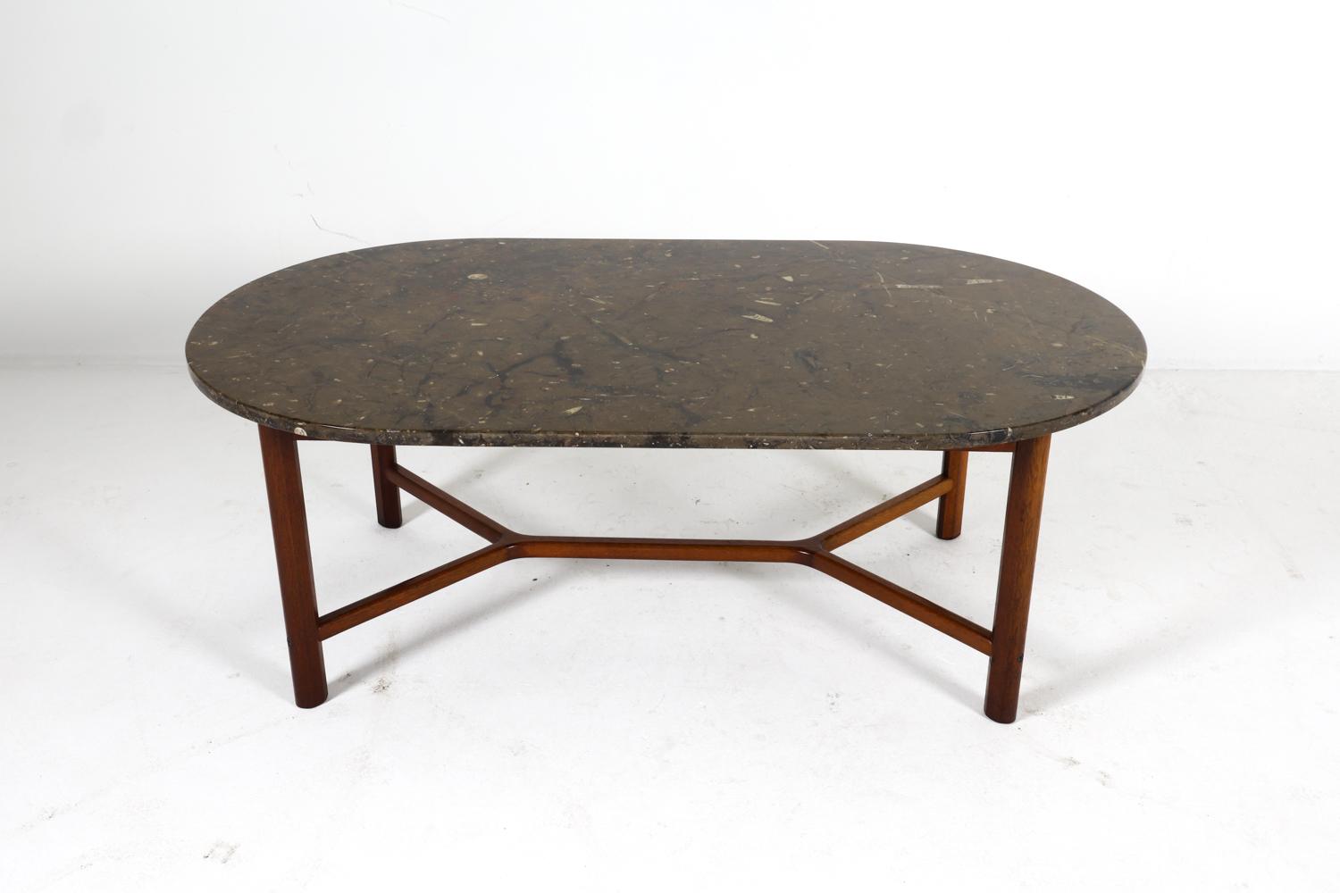 oval coffee table with teak base and marble top finished with an acrylic coating. scandinavia, circa 1970s. elegant proportions with a cross-stretcher base and richly veined stone surface. minor scuffs and dings to wood. wear consistent with age and use.