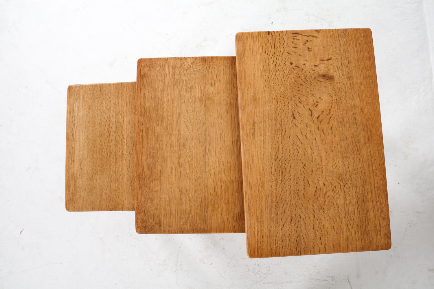 set of three oak nesting tables in the style of henning kjaernulf. denmark, circa 1970s. turned legs with stretcher bases and solid oak tops. few faint water rings and light wear consistent with age and use.