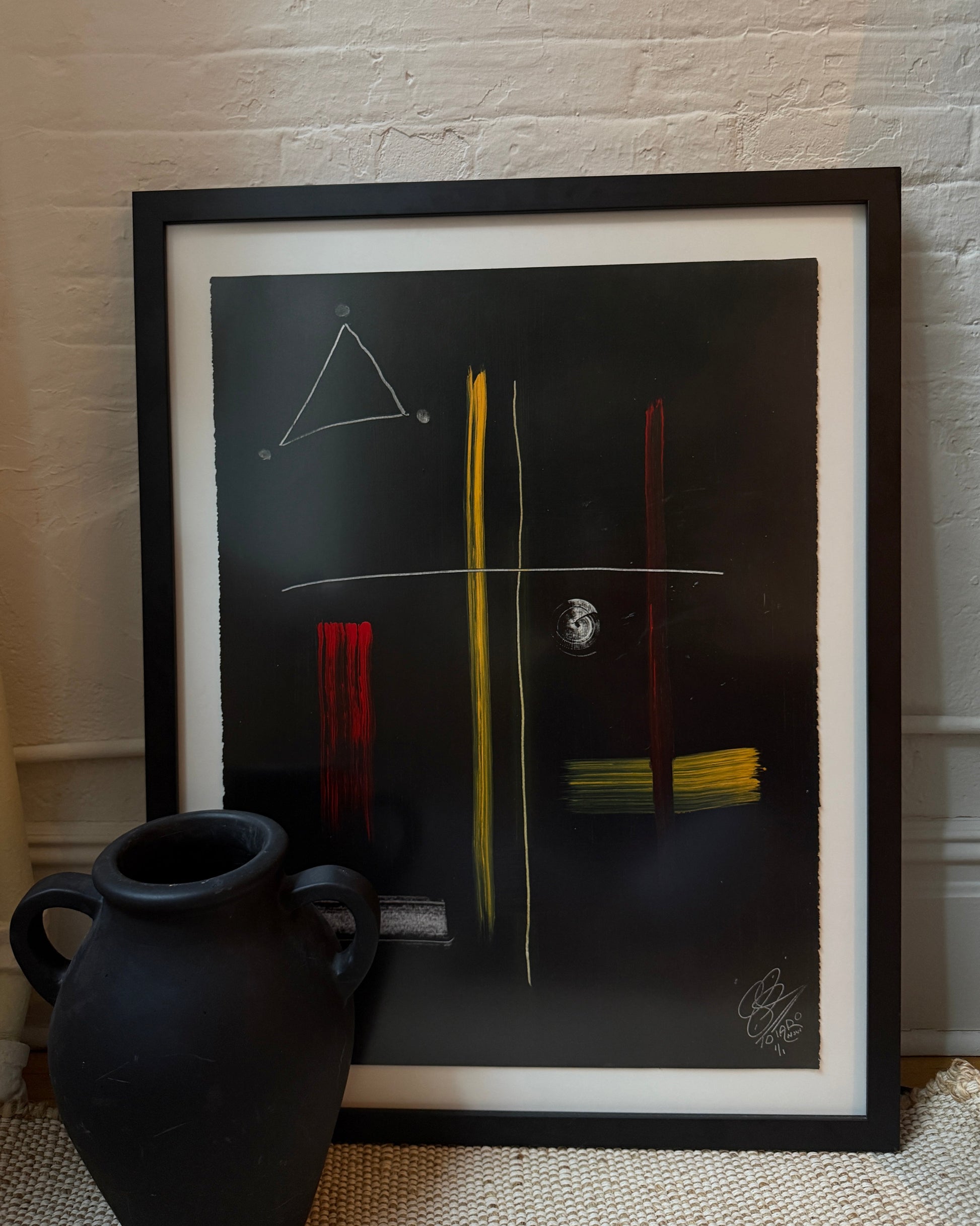 framed in a simple black frame with white matting, giving the piece a crisp, gallery-ready presentation. reads bold but restrained - works beautifully as a standalone statement or layered into a collected wall.
