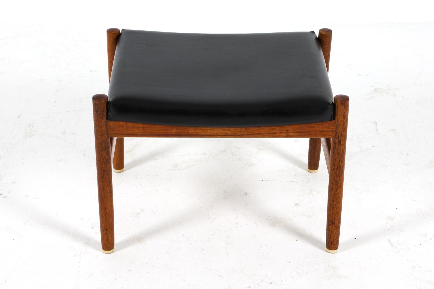 solid teak frame with original black leather seat. clean lines and warm tone, ideal as accent seating or a footrest. minor scuffs to wood and leather. wear consistent with age and use.