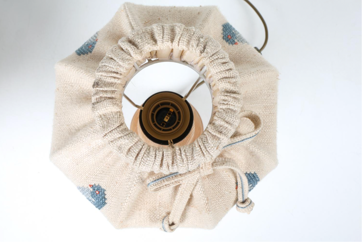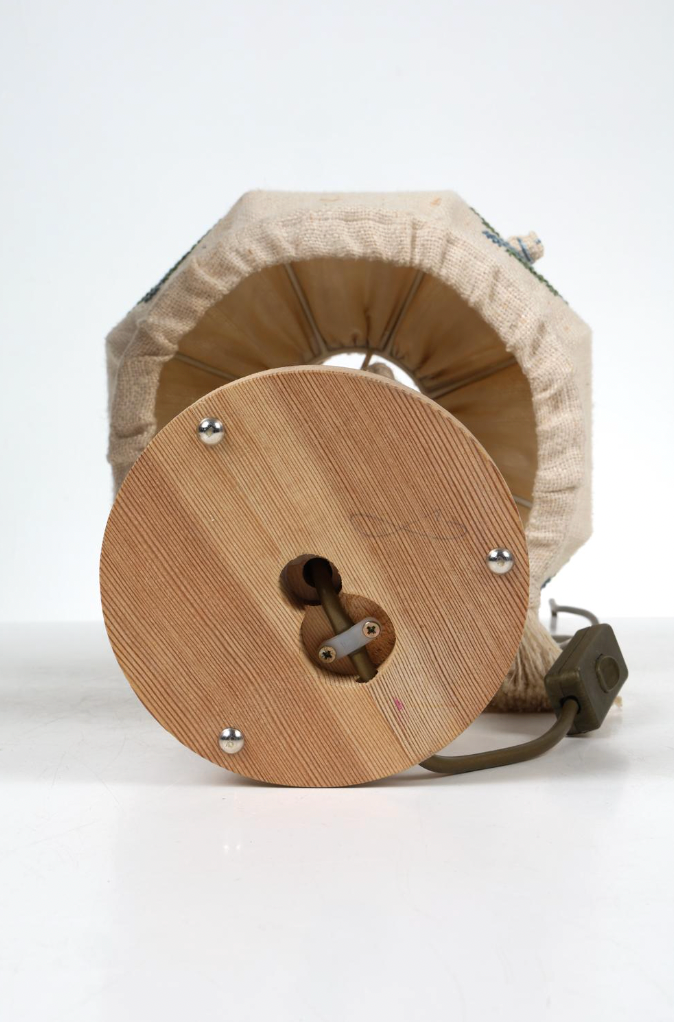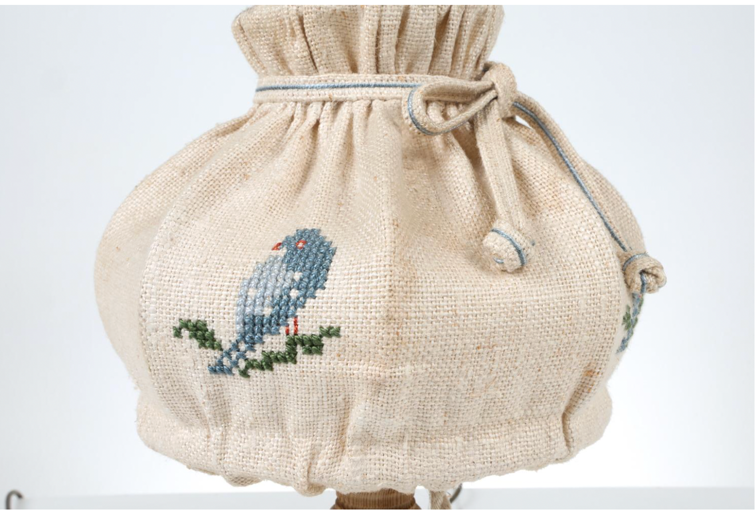a pair of turned pine table lamps featuring original embroidered linen shades with hand-stitched bird motifs and tassel ties. each lamp showcases beautiful grain detail and a softly sculptural silhouette, adding warmth and texture to any room.