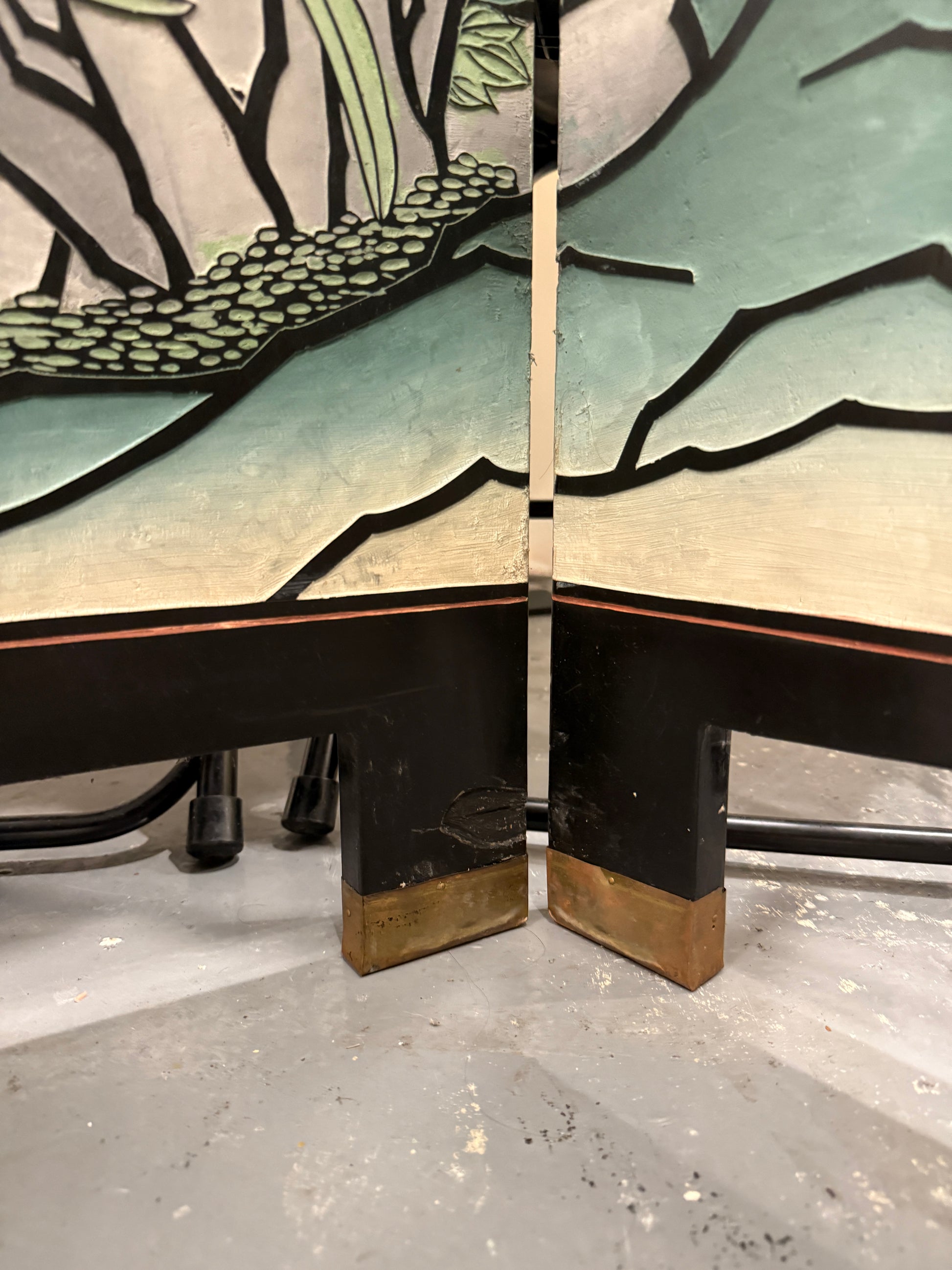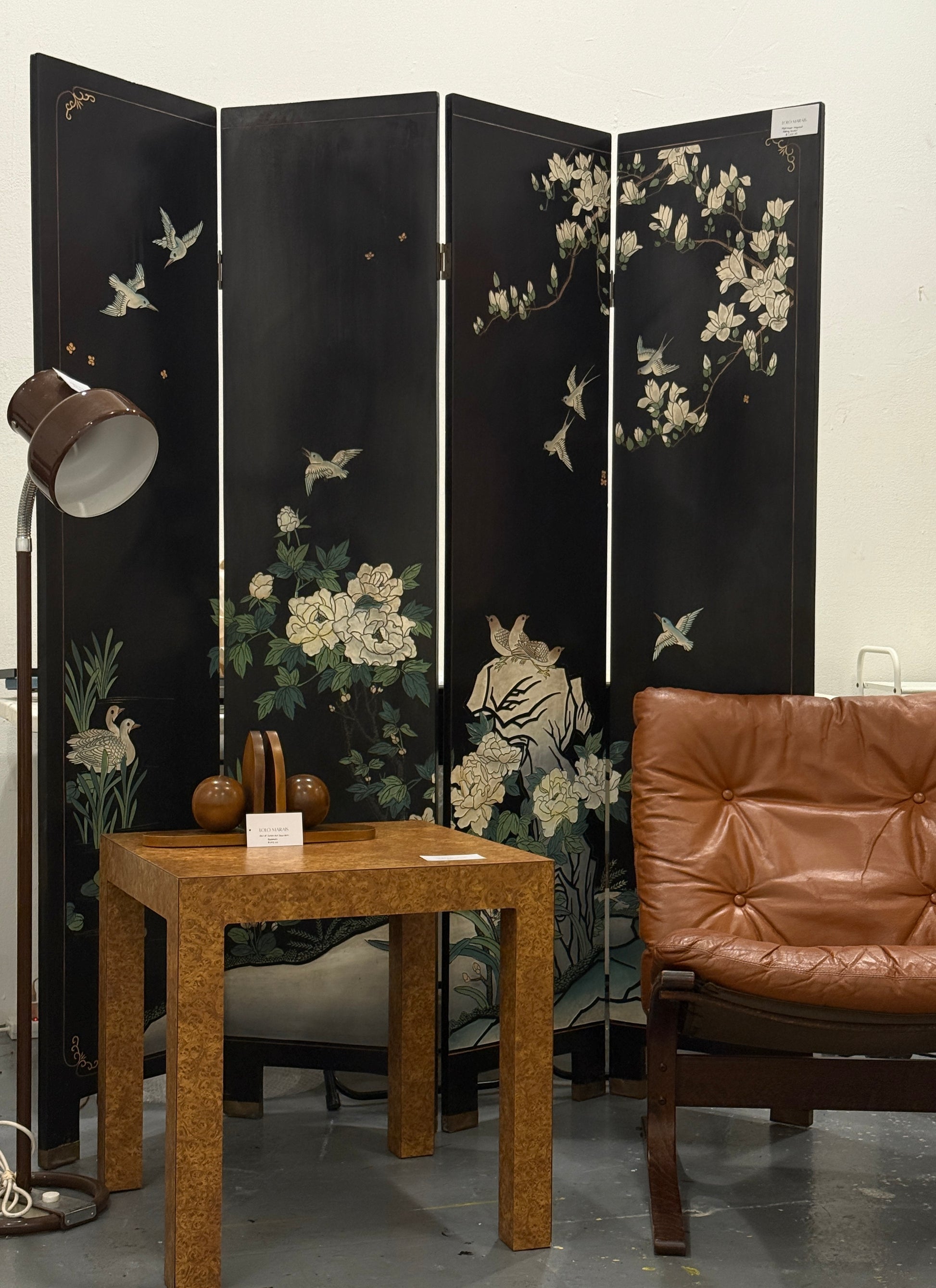 a vintage asian mcm hand-painted folding screen, circa 1970s. the four-panel piece features a black lacquer finish with floral and bird motifs on both sides, offering a striking balance of depth and delicacy. the reverse reveals a soft landscape scene in muted greens and ivory tones, and the panels rest on brass-capped feet.