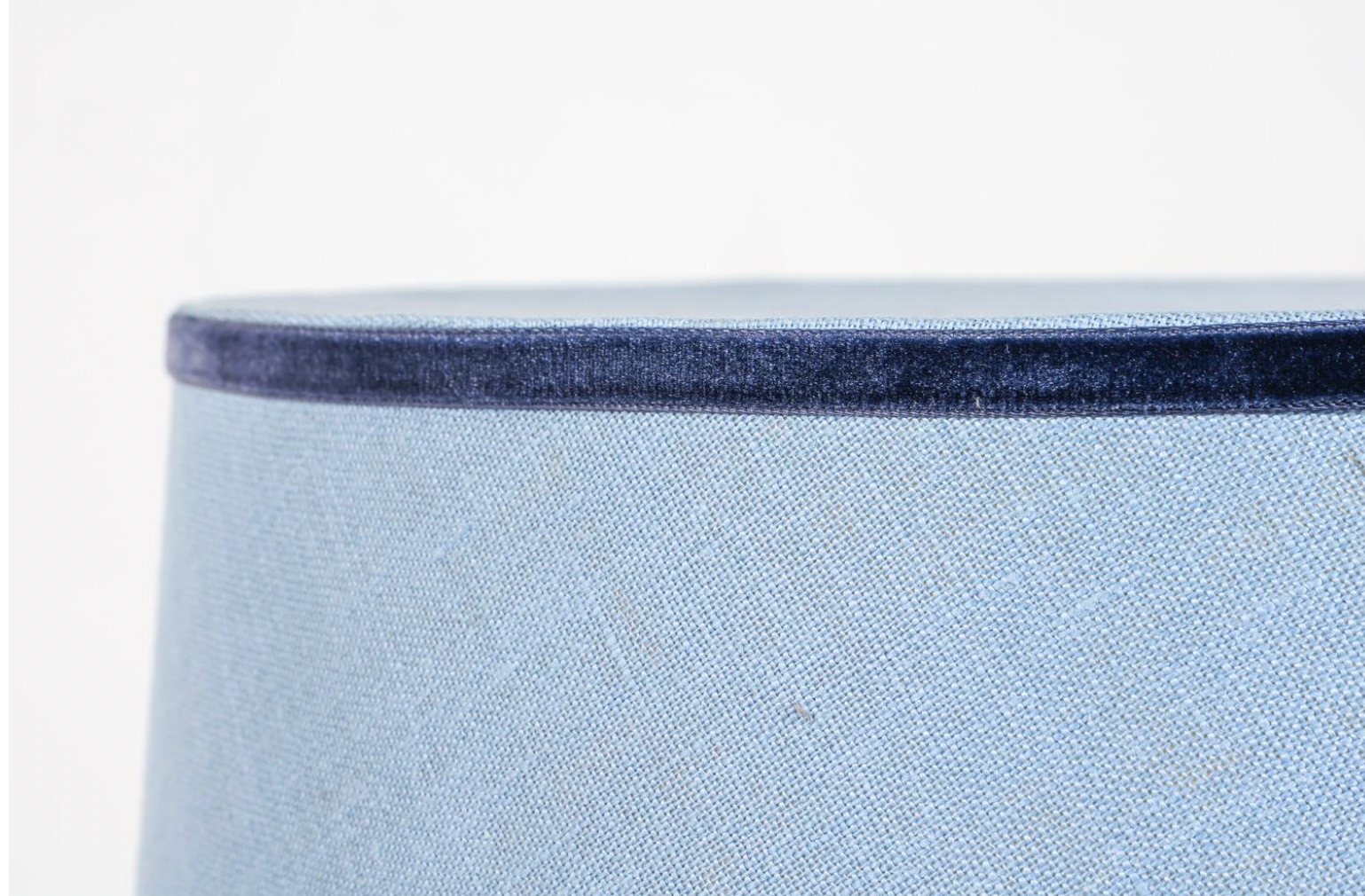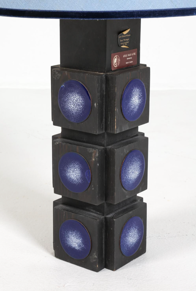 swedish table lamp by ateljé glas & trä, circa 1960s. stacked teak base with inset cobalt glass discs and original linen shade. sculptural design that functions as both lighting and object.