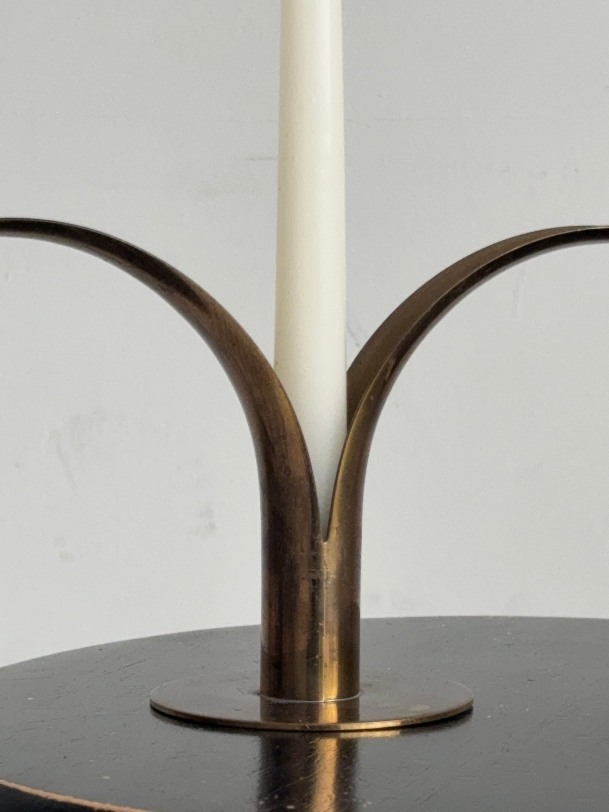 sculptural vintage brass candleholder with a softly arched, petal-like form. warm aged brass with a subtle patina that highlights the curves and depth of the silhouette. a quiet statement piece that works beautifully on a dining table, console, or bedside.