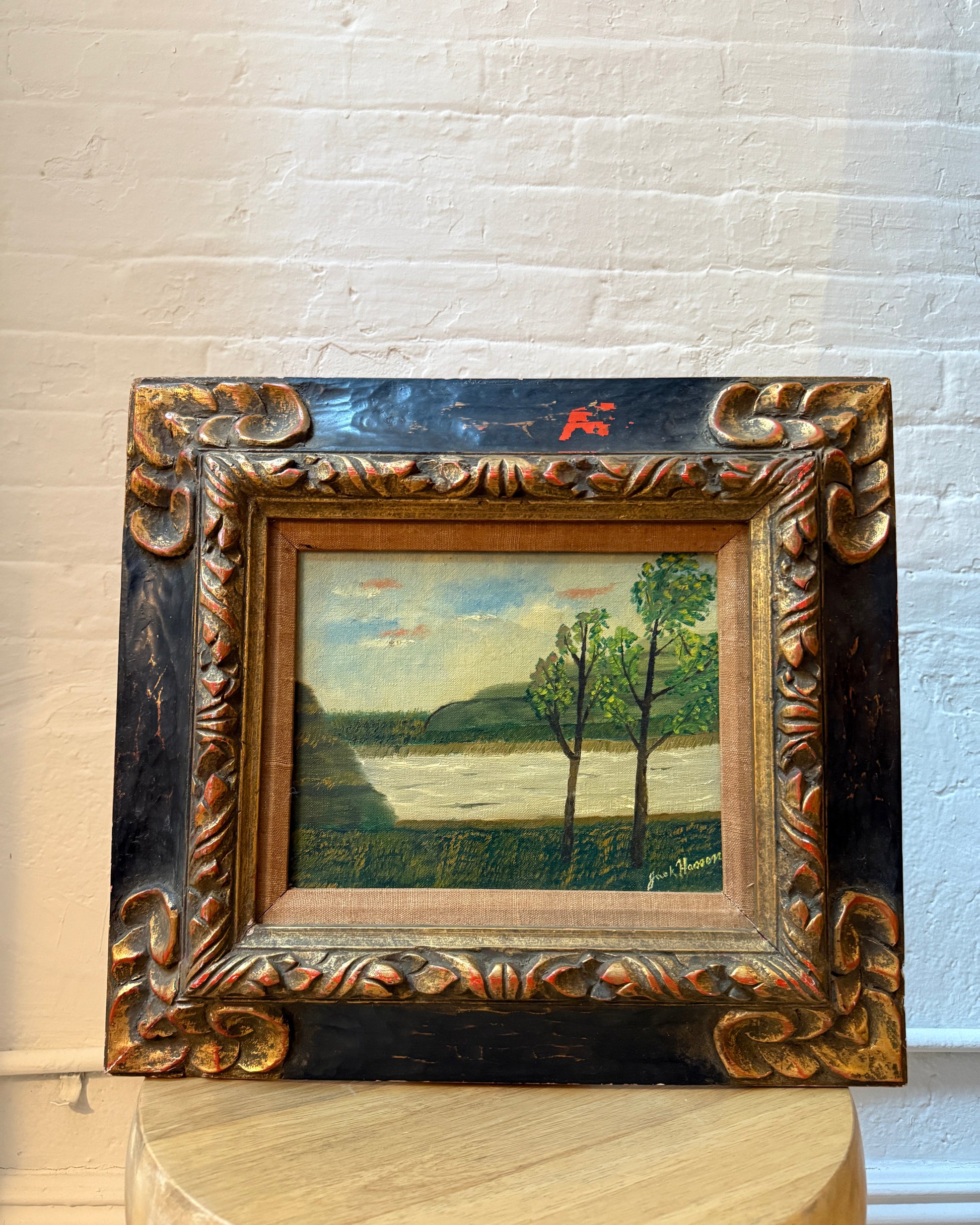 a softly colored vintage landscape painting in muted greens and blues, set in a beautifully aged carved wood frame with rich patina. an easy, timeless piece that adds warmth and character without overpowering a space.